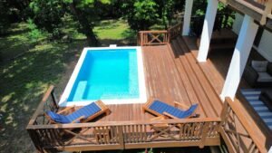 A huge private deck has a gas BBQ, picnic table, sofa set, loungers and plunge pool. Bring the yoga mats out for a morning stretch. Watch for the colourful Macaws that sometimes fly by!