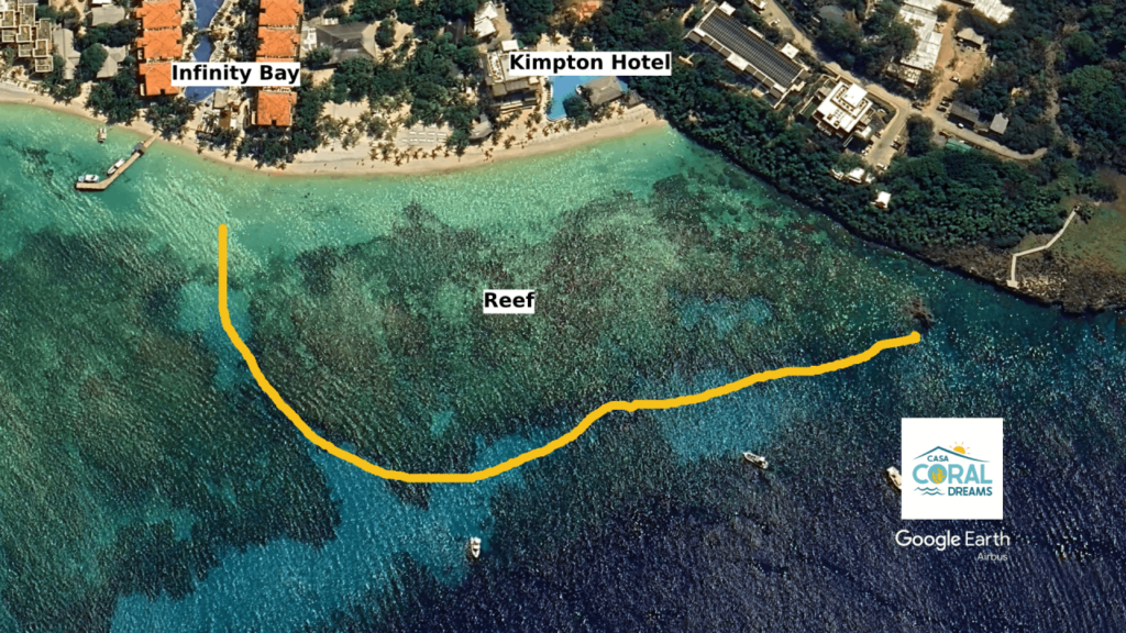 The other place people say to enter is in front of Infinity Bay. Either place is fine. The reef is basically between Infinity Bay and the Kimpton. Over in front of Infinity Bay, there is a natural alley to swim in between the reef. If you enter in between, like for example in front of Govenors Palace, there are some parts that are very shallow and you could cut yourself or damage the reef.